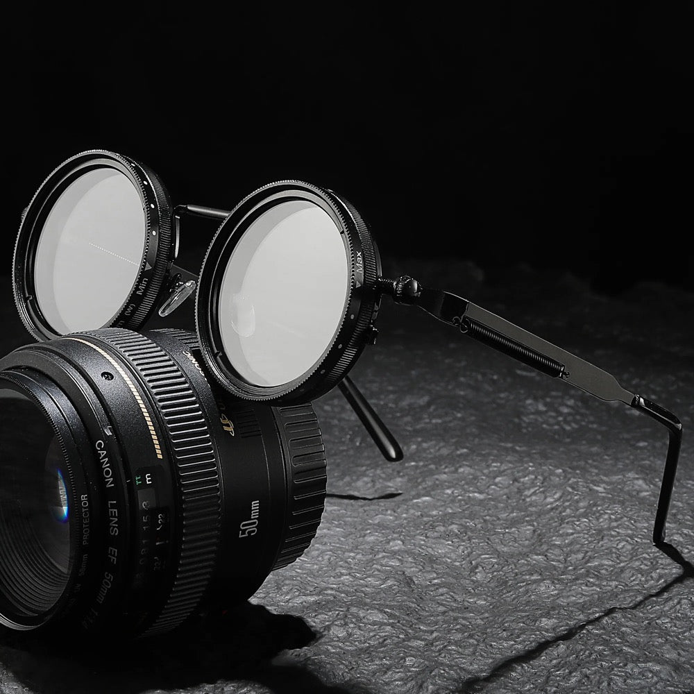 Introducing our ND9 stepless adjustable dimming steampunk sunglasses. These distinctive sunglasses combine a retro-futuristic design with modern functionality. featuring a manual dimming mechanism that allows you to precisely adjust lens brightness. With a unique steampunk aesthetic and advanced technology. these sunglasses offer perfect vision in any lighting condition. making them ideal for driving. outdoor adventures. or even a stylish vacation.